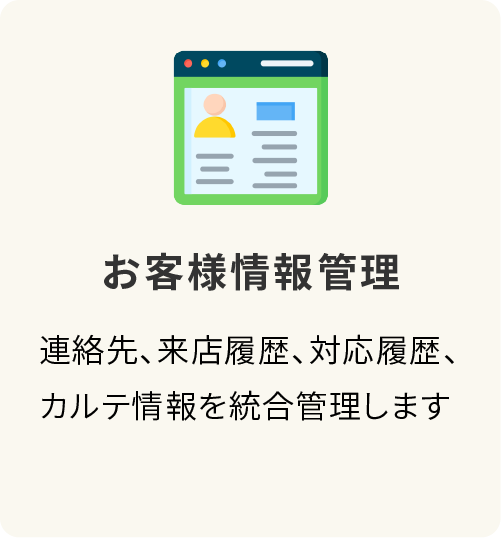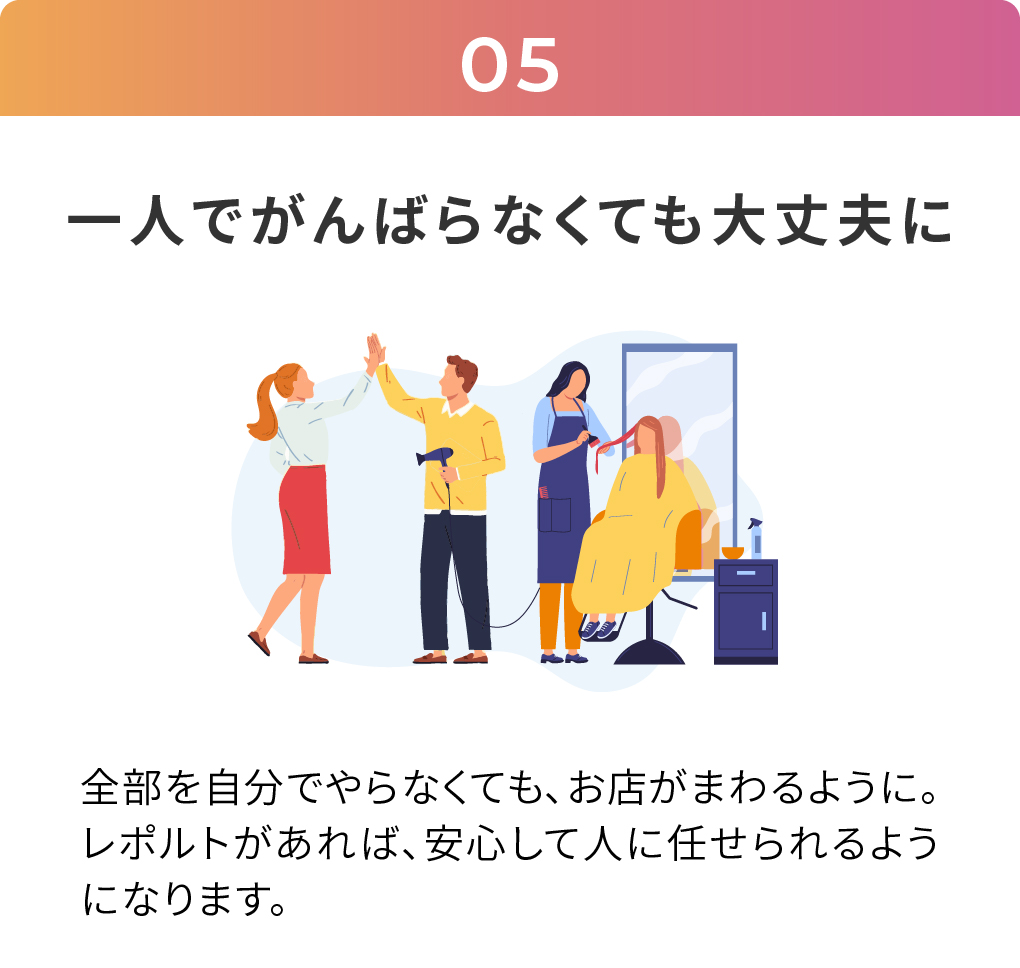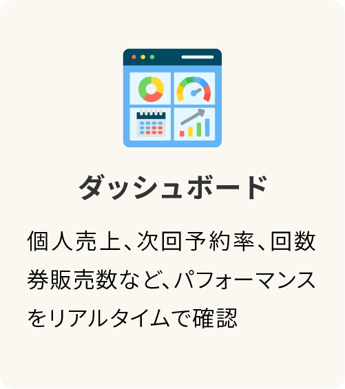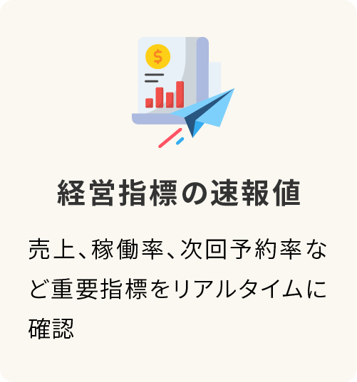 リピート率や予約の流れ、スタッフごとの売上などをわかりやすく表示。 気づきにくい課題も早めに把握できるから、問題が大きくなる前に対策を打てます。日々の多様な業務を推進する中でも、安心して店舗の状態を見守ることができます。