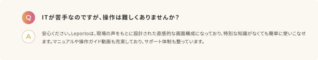 安心ください。Leportoは、現場の声をもとに設計された直感的な画面構成になっており、特別な知識がなくても簡単に使いこなせます。マニュアルや操作ガイド動画も充実しており、サポート体制も整っています。