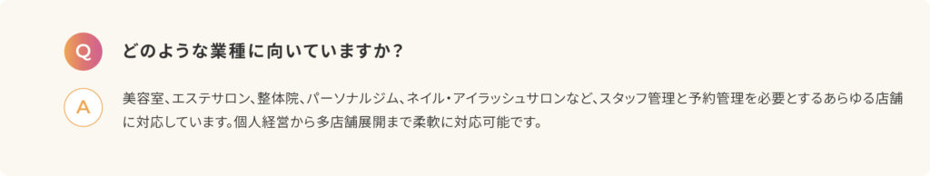 美容室、エステサロン、整体院、パーソナルジム、ネイル・アイラッシュサロンなど、スタッフ管理と予約管理を必要とするあらゆる店舗に対応しています。個人経営から多店舗展開まで柔軟に対応可能です。