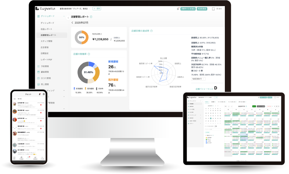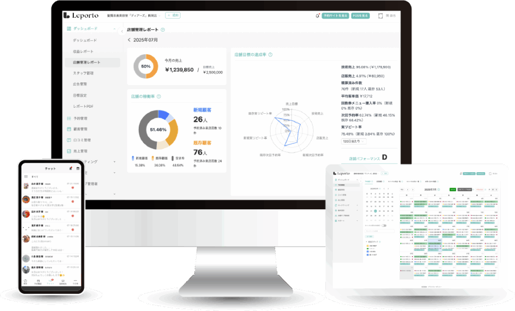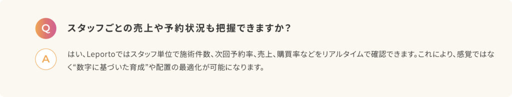 はい、Leportoではスタッフ単位で施術件数、次回予約率、売上、購買率などをリアルタイムで確認できます。これにより、感覚ではなく“数字に基づいた育成”や配置の最適化が可能になります。