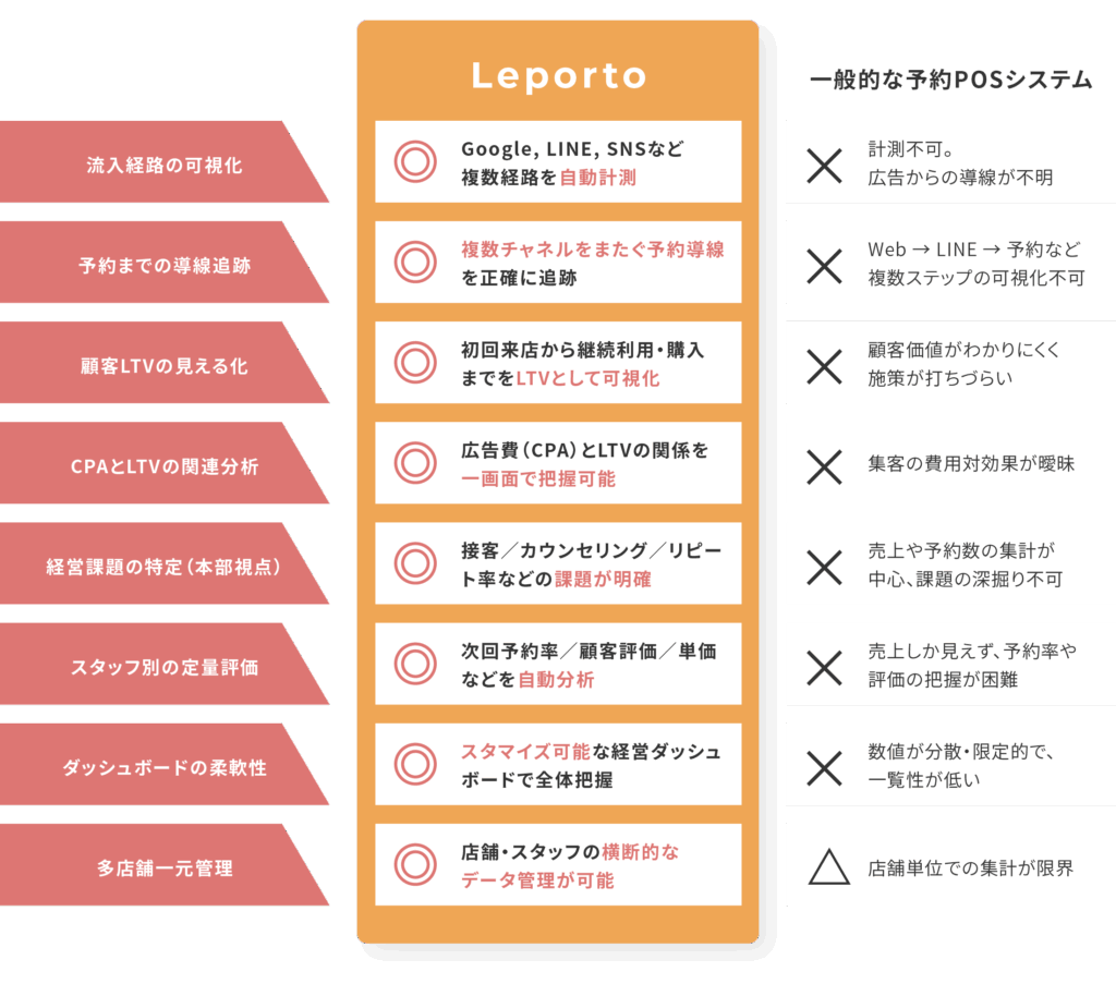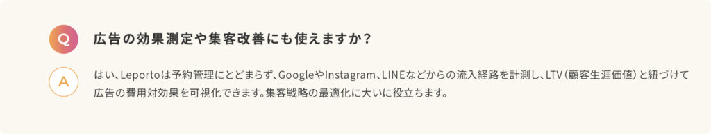 はい、Leportoは予約管理にとどまらず、GoogleやInstagram、LINEなどからの流入経路を計測し、LTV(顧客生涯価値)と紐づけて広告の費用対効果を可視化できます。集客戦略の最適化に大いに役立ちます。