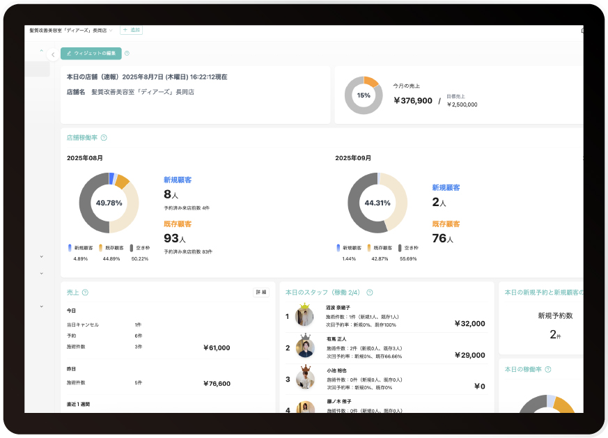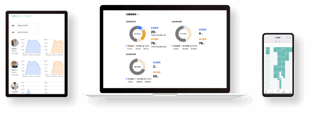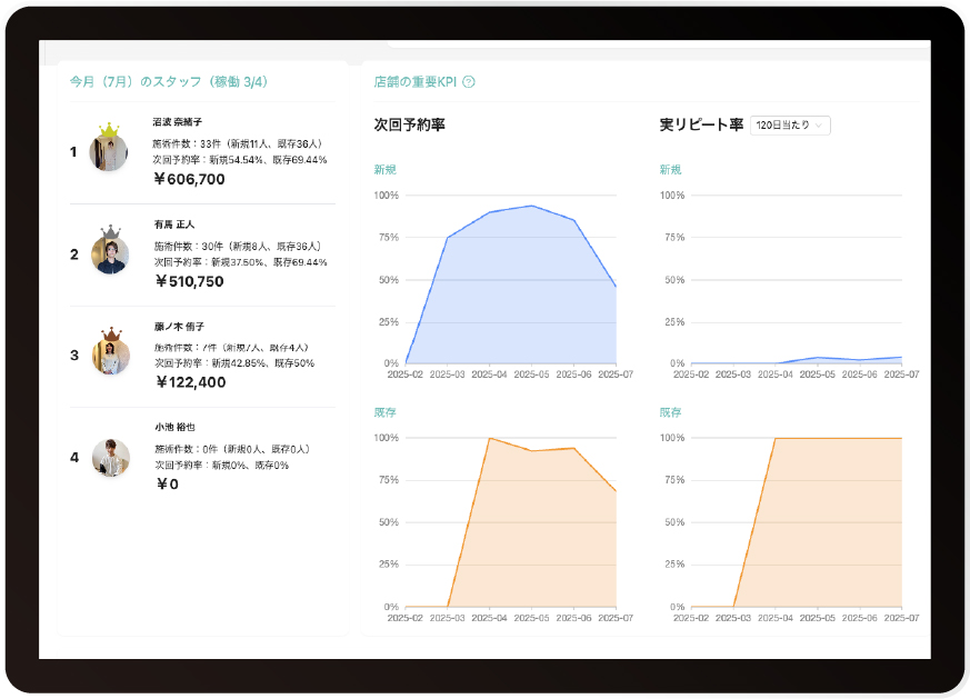 新規・既存の次回予約率、実リピート率、稼働率、単価など、サロン経営に必要な指標をグラフで自動表示。