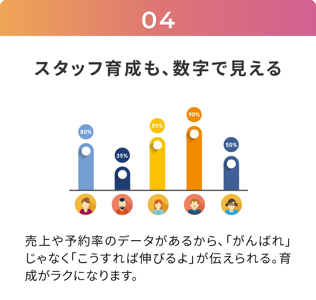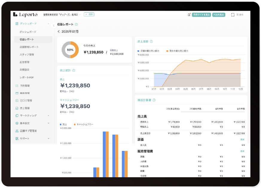 売上の推移やスタッフの成長、広告の効果などをグラフで確認。 いつどのくらいの売上に到達するのかデータで算出されるので、スタッフ雇用や新規店舗出店のタイミングを適切に把握できます。 オーナーとしての視点が自然に身につき、経営に拍車が掛かります。