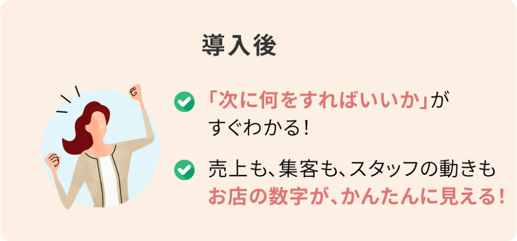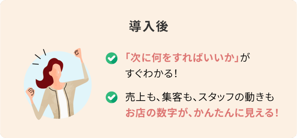 以前は再来店してくれるかどうか、なんとなくの雰囲気頼みでしたが、Leporto導入後は、数値で顧客の動きが見えるようになりました。施術後の予約率、回数券の購入率などをもとに、スタッフごとに強みと改善点を把握できています。スタッフ自身が目標を意識し、自ら改善策を講じてくれるようになり、結果的にリピート率もアップ。数字が現場を育てる感覚を初めて実感しました。