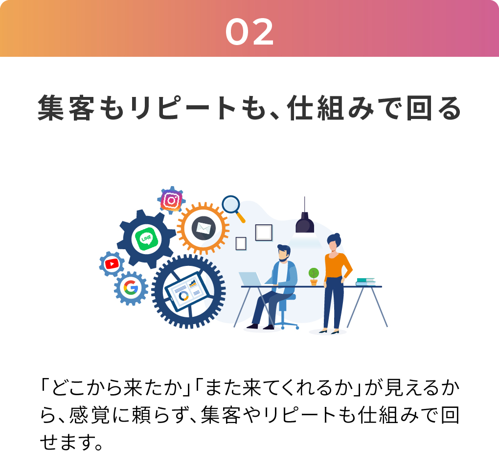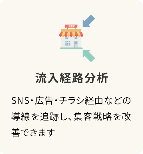 広告の効果やお客様の来店経路、リピートの状況までが一目でわかります。